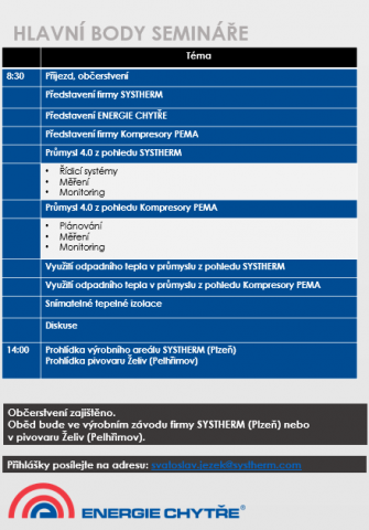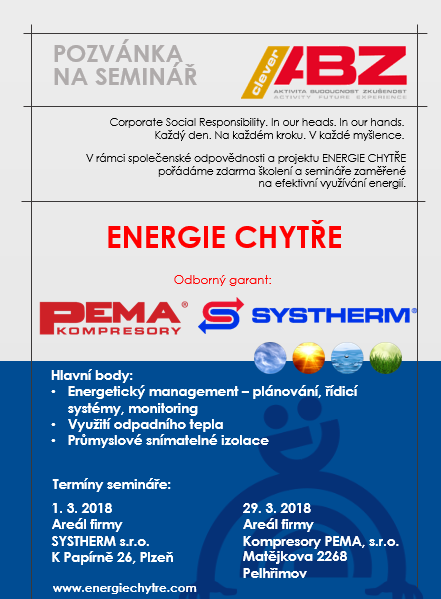 V rámci projektu CleverABZ jsme připravili seminář ENERGIE CHYTŘE na téma Energetický management a využití odpadního tepla. Odbornými garanty jsou firmy Kompresory PEMA, s.r.o. a SYSTHERM s.r.o.